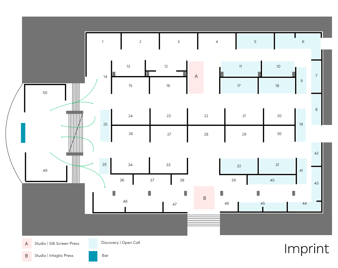 With the exception of sculptural/installation works, all artworks on display must be hung on the panels provided and will not be allowed to remain resting on the floor of the stand unless hidden from view in a purpose-built storage area. Additionally print racks are only permitted on a stand if they can be accommodated in a storage area.